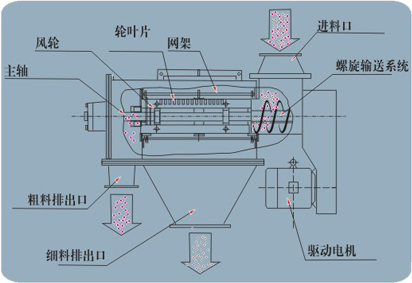 本設備篩網為圓筒狀,置于機體內,物料通過螺旋輸送系統后,和氣流混合、霧化進入網筒內;通過網筒內風輪葉片使物料同時受離心力和旋風推進力,從而迫使物料噴射過網,由細料排出口排出,不能過網的物料沿筒壁從粗料排出口排出。
